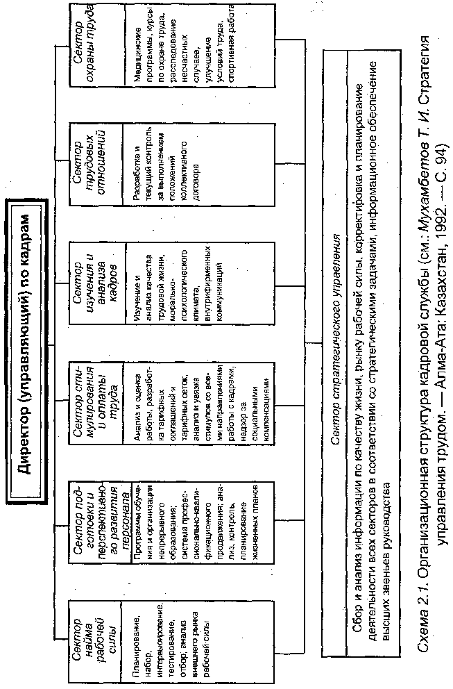 Принципиальное построение кадровой службы в современных условиях не имеет общепризнанной формы. Один из ее вариантов представлен на схеме 2.1. Он ориентирован на стандартный набор работ и реализацию стратегического подхода в кадровой политике в увязке с развитием предприятия (организации).