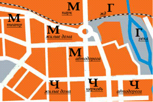 Вопрос 8. Нарисуйте план городского земельного участка, на котором расположены здания суда, жилых домов (муниципальных и частных), церкви, объектов социально-культурного назначения (например, муниципального театра, парка и т.п.); через участок проходят две автомобильные дороги разного значения и железная дорога, а также протекает река. Отметьте на плане отличительными знаками или цветами, какие земли, на которых размещаются указанные объекты, относятся, по вашему мнению, к землям государственной, муниципальной и частной собственности. Аргументируйте свой ответ.