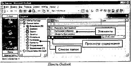 Задачи - содержит список дел, которые необходимо выполнить. Их можно расставлять по приоритетам и поручать другим исполнителям. Здесь можно не только сформулировать задание, но и послать указание по электронной почте исполнителю. Приприеме такого поручения папка "Задачи" каждого исполнителя
