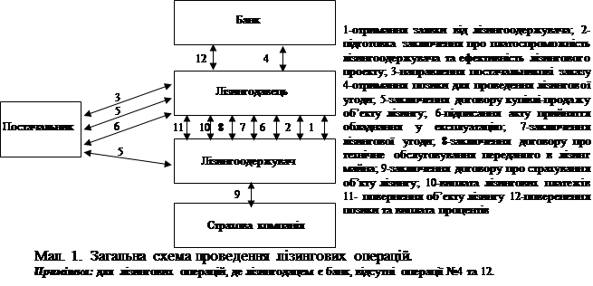 Трохи нище ми дамо і загальну схему проведення лізингових операцій. Далі ж ми більш детально розглянемо етапи процесу підготовки і реалізації лізингових положень, що їх проходять суб’єкти лізингу, серед яких лізингодавцем виступає банк.
