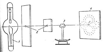 Принципиальная схема метода дана на рисунке слева; 1- рентгеновская трубка, 2 - диафрагма, 3 - кристалл, 4 - фотопластинка. Когда пучок неоднородных лучей падает на кристалл, каждая атомная плоскость отражает лучи соответствующей длины волны (согласно уравнению Вульфа-Брегга). В результате такого селективного (выборочного) отражения рентгеновских лучей отдельными плоскостями на фотопластинке получается .ряд интерференционных пятен различной интенсивности. Происхождение этих пятен для одного из семейств плоскостей иллюстрируется на рис.1.