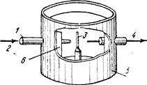 | Рис. 3 Принципиальная схема съемки по методу порошка: / — диафрагма: 2 — место входа лучей; 3 — образец: 4 — место выхода лучей; 5 — корпус камеры; б — (фотопленка) |
