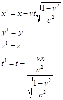 Лоренцевы преобразования - это новые (отличные от галилеевых) правила перехода от одной инерциалыюй системы отсчета к другой. Для одной точки в декартовой системе координат без штрихов при переходе к системе отсчета со штрихами лоренцевы преобразования устанавливают следующие правила: