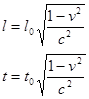Здесь l -длина движущегося стержня, l 0 - длина покоящеюся стержня, v - скорость движения стержня (системы отсчета), t - время покоящегося стержня, t0 - время движущегося стержня, с - скорость света в пустоте. [2]