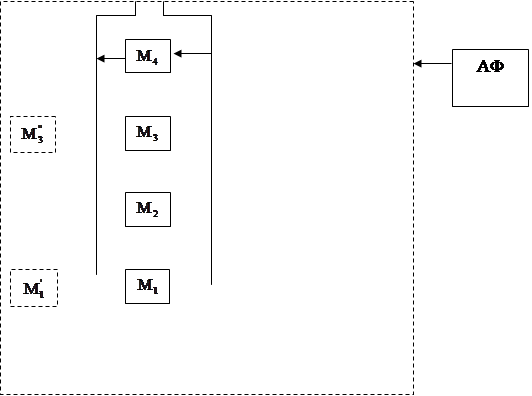 В состав модели интеллекта включены: ПМ – центры памяти, Р – рецепторы, АР – анализаторы рецепторов, АФ – центры абстрагирования и формализации, ЦЭ – центры эмоций, СУТ – система управления торможением, ОИ – центры обработки информации, КИ – центры конкретизации и интерпретации, М – нейронная модель.
