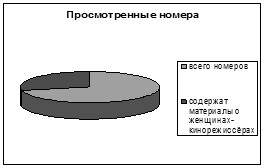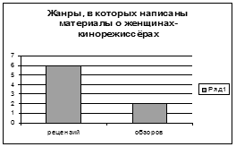 Всего нами было просмотрено двадцать номеров. В восьми из них содержались материалы о женщинах-кинорежиссёрах. В том числе: рецензий – шесть; критических обзоров – два. Эти факты мы отразили в нижеприведённых диаграммах.