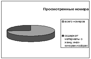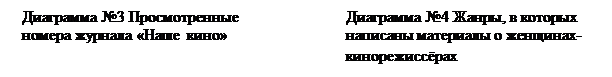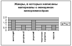 Материалы о женщинах-кинорежиссёрах содержались в семи из двадцати просмотренных номеров. В том числе: две аннотации, один репортаж, две рецензии, один творческий портрет, один опрос. Что так же отраженно в диаграммах.