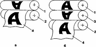 Рисунок 2 – Схема прямого (а) та непрямого або офсетного (б) друку: 1 – формний циліндр, 2 – друкарський циліндр, 3 – офсетний циліндр, 4–задруковуванийматеріал