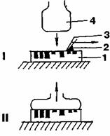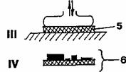 Рисунок 4 – Принципова схема процесу тамподруку: І – подача фарби на друкарські елементи форми; II – перенесення зображення з форми на тампон; III – нанесення зображення на задруковуваний матеріал; IV – вигляд результатів друку; 1 – друкарська форма глибокого друку, 2 – фарба, 3 – ракель, 4 – тампон, 5 – задруковуваний матеріал, 6– відбиток