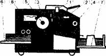 Рисунок5 – Принципова схема різографа: 1 – вбудований сканер оригіналів, 2 – термоголовка для виготовлення трафаретної форми, 3– формонесучий циліндр, 4– рулон із формною основою (майстер-плівкою), 5– туба з фарбуючою речовиною, 6 – аркушеподаючий лоток, 7– приймальний лоток, 8 – система видалення та зберігання відпрацьованих форм