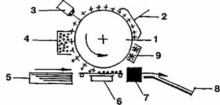 Рисунок 6 – Принципова схема електрографічного (лазерного) способу друку: 1 – фотопровідниковй барабан, 2 – заряджаючий пристрій, 3 – лазерна система насвітлення зображення, 4 – пристрій нанесення тонера, 5 – аркушеживляча система, 6– пристрій переводу тонерного зображення на задруковуваний матеріал, 7– пристрій термозакріплення зображення, 8 – вивідний пристрій, 9 – система очистки поверхні барабана