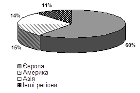 Як видно з діаграми, левова частка доходів Рейтер припадає саме на європейський регіон.