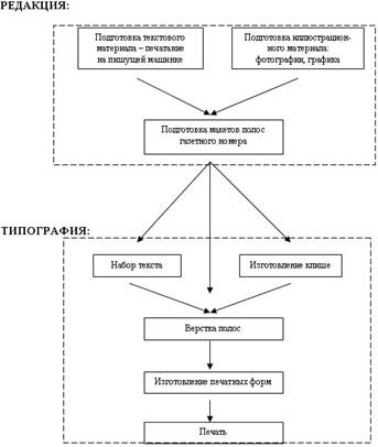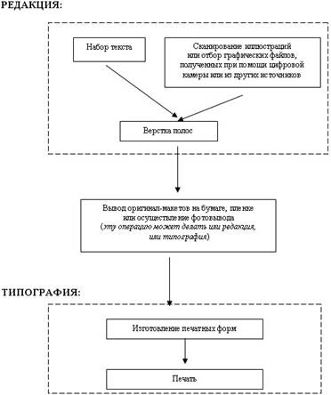 Представим схематично распределение технологических процессов между редакцией и типографией. При традиционной «горячей» технологии схема такова: