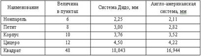 В полиграфии, следовательно, и при оформлении печатных изданий, используются особые единицы измерения – типометрические. Одна из них – система Дидо – распространена в большинстве европейских стран, в том числе в России. Она основана на французском дюйме, существовавшем до введения метрической системы, и была введена в XVIII в.: предложил ее в 1737 г. французский словолитчик П.С. Фурнье, позже, в конце того же столетия, систему усовершенствовал Ф.-А. Дидо, представитель известной семьи парижских типографов, и ее стали называть типометрической системой Дидо. В основе лежит типографский пункт, равный 1/72 французского дюйма, иначе 0,3759 или округленно 0,376 мм (французский дюйм равен 27,1 мм). Для более крупных измерений применяется типографский квадрат, равный 48 пунктам (18 мм). Промежуточной единицей измерения является цицеро, равное ¼ квадрата или 12 пунктам (4,5 мм).