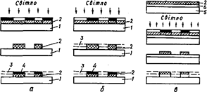 Рис. 1. Схемы изготовления офсетных печатных форм: монометаллической негативным (а) и позитивным (б) копированиями, а также полиметаллической травлением металла на пробельных элементах (в): 1 – алюминиевая пластина; 2 – копировальный слой; 3 – гидрофильная пленка; 4 – краска; 5 – сталь; 6 – медь