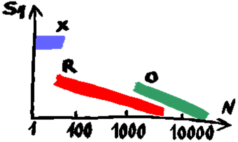 На рис.11 показано место ризографии в сравнении с другими способами печати -- ксерокопированием и офсетом (Х -- ксерокс, R -- ризограф, O -- офсет, S1 -- стоимость печати одного листа, N -- объем тиража).