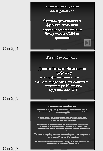 Структура работы. Работа состоит из введения, трех глав, заключения и библиографического списка используемых источников, включающего 36 источников, в том числе 14 Интернет-ресурсов. Данное исследование – это попытка собрать актуальную практическую информацию о современной деятельности собственных корреспондентов белорусских СМИ за границей. Находясь в другом государстве, иностранные корреспонденты имеют блестящую возможность пользоваться последними разработками в области информационных технологий и одновременно делиться опытом со своими белорусскими коллегами. Работа журналиста – это двадцатичетырехчасовой труд, который зачастую не оставляет времени для записей, научной работы. Данное исследование построено на личном общении с представителями журналистской профессии. Особую роль сыграла информация, предоставленная Анатолием Иосифовичем Ширвелем, заведующим отделом корреспондентской сети дирекции информационного вещания телеканала "ОНТ", а также беседы с Ниной Вишневой, собственным корреспондентом телеканала "ОНТ" в США. Среди теоретических источников отмечу "Информационные технологии в журналистике" В.В. Кихтана, "Содействие доступу журналистов к информации в России и других странах бывшего СССР" А.Г. Рихтера и другие.