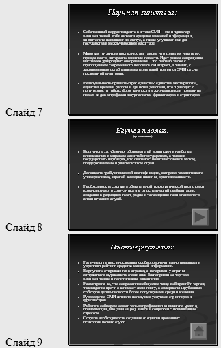 Второй этап (апрель 2009) – практический. В рамках обработки печатных копий видеосюжетов Нины Вишневой, опираясь на теоретическую базу, проведен анализ собранных документов. На основе результатов работы выделены особенности использования информационных технологий собственным корреспондентом за границей, определены основные характеристики подготовленных материалов, выделены закономерности в работе репортера в связи с принципиальной иной системой информационного оснащения рабочего места корреспондента.