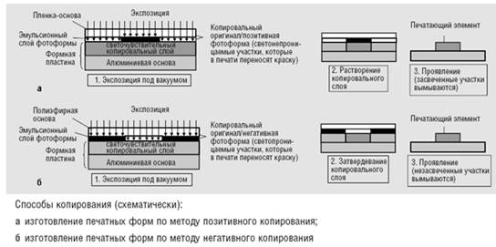 При фотохимическом задубливании КС на засвеченных участках становится нерастворимым для проявителя. Если, наоборот, КС фотохимически разрушается, то проявитель растворяет засвеченный слой, удаляя его с подложки (например, алюминия). Т.о., возможны два различных способа копирования: позитивное и негативное. Они требуют различной засветки для образования изображения, т.е. различных предварительно изготовленных фотоформ.