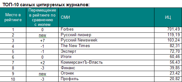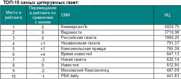 Компания «Медиалогия» составила рейтинги цитируемости российских федеральных СМИ за август 2009 года (http://www.advertology.ru/article73547.htm )