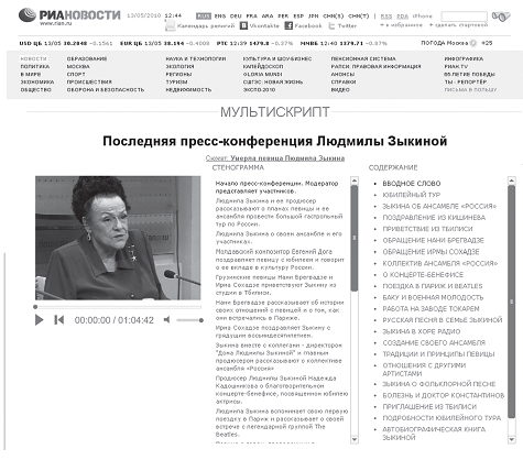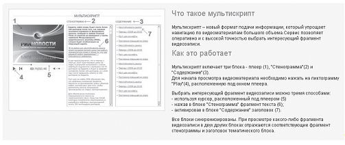 РИА «Новости» активно использует такую новую технологию, как мультискрипт, которая делает просмотр видеоинформации еще более интерактивным — в большом сюжете пользователь может без труда посмотреть наиболее интересные для него моменты, не загружая сюжет полностью и не ища в нем нужный момент. К тому же в мультискрипте есть своеобразное краткое содержание сюжета и стенограмма события (см. приложение 4).