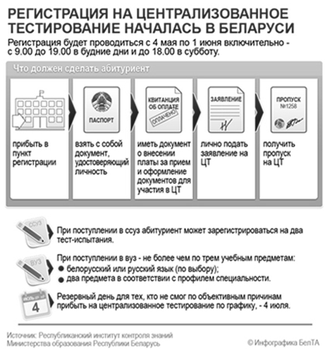 Стоит отметить высокое качество инфографики БЕЛТА и ее тематическое разнообразие. Агентство освещает таким образом совершенно разные темы — последствия чернобыльской катастрофы, строительство жилья, план приватизации на 2011-2013 годы, биологическое разнообразие в Беларуси, победители конкурса «Телевершина», информация о вреде курения. Например, инфографика о регистрации на централизованное тестирование дает абитуриентам очень полную и упорядоченную информацию о правилах регистрации и необходимых документах (см. приложение 5).