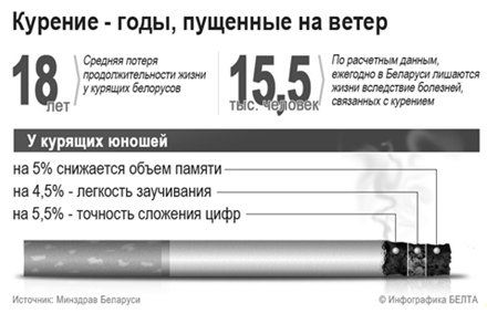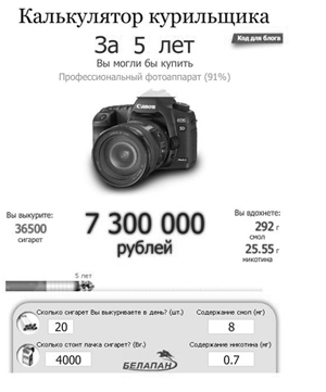 Инфографика БелаПАН бывает и информационно-развлекательной, как, например, ко Дню борьбы с курением (см. приложение 7). Курящим пользователям предлагалось ввести данные о своем стаже курения и количестве выкуриваемых сигарет в день, в ответ они могли узнать, какие суммы тратят на эту пагубную привычку и какой товар могли бы за нее купить (напр. фотоаппарат, ноутбук или автомобиль).