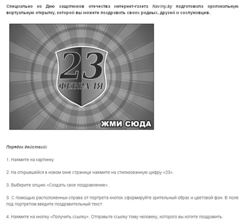 К праздникам naviny.by обычно запускают сервис флэш-открыток. Пользователям предлагается заполнить определенные поля открытки и отправить ее своим друзьям и близким (см. приложение 8).