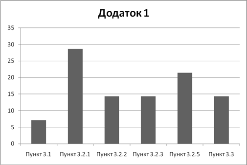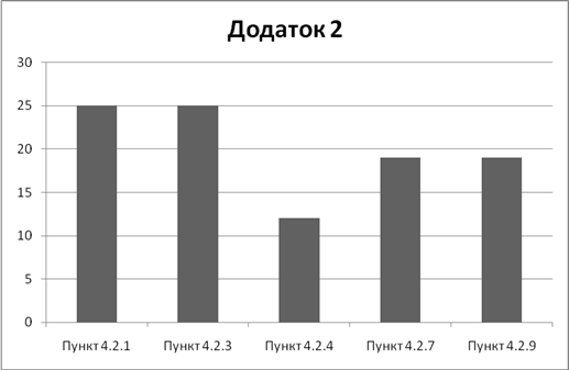 Також за допомогою складеної гестограми можна побачити які саме пункти стандарту ГСТУ 29.1 – 97 для журнальних видань порушуються. Порушено такі пункти: 4.2.1 – формат журналу; 4.2.3 – використання шрифтів різних гарнітур для журналів, які друкуються глибоким способом друку. Ці порушення складають 25%. Також порушення пунктів 3.2.7 – Якість, та контрастність зображень та їх розміщення; 3.2.9 – наявність обов’язкових елементів на обкладинці. Ці порушення складають 19%.