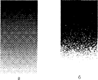 Рисунок 1 – Схематичне зображення растрованого напівтонового клину: а – традиційний растр, б – частотно-модульований (стохастичний) растр