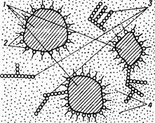 Рисунок 8 – Стабілізація пігменту у в'яжучому: 1 – пігмент; 2 – сольватні оболонки з молекул поверхнево-активних речовин навколопігменту; 3 – асиметричні молекули або флокули-пачки молекул смол; 4 – дисперсне середовище