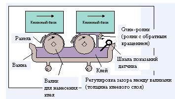 Конструкции клеевых аппаратов в современных машинах КБС весьма разнообразны. Как правило, эти аппараты имеют индивидуальный привод, обеспечивающий равенство окружной скорости вращения наносящих валиков и линейной скорости движения блока. Для регулирования толщины наносимого клея применяются ракели. Клеевой аппарат может содержать дополнительные валики или щетки для втирания и разглаживания клея. Излишки клея удаляются специальным скребком. Аппараты для нанесения термоклеев оснащаются системами регулирования температуры. Иногда, в особенности при применении полиуретановых термоклеев, такие аппараты могут иметь закрытую конструкцию. На рис.3.1.1. приведена схема возможного построения машины КБС.