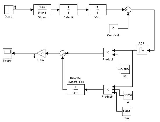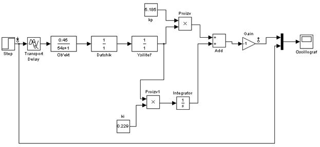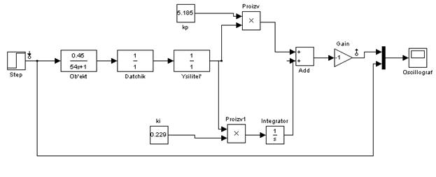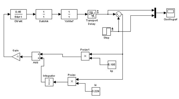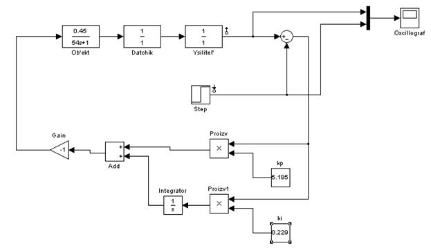 С помощью программы Matlab и Simulink Library Browser установим новую панель для моделирования системы, затем наберем на данной панели математическую модель замкнутой системы управления непрерывным технологическим объектом, изображенную на рис. 5.1.1. Для этой системы установим значения T 0 = 54 с и k 0 = 0,45 согласно варианту; k п = 5,185 и k и = 0,229 1/с согласно расчетам (см. п. 4.1).