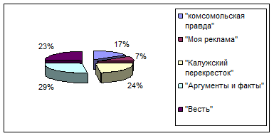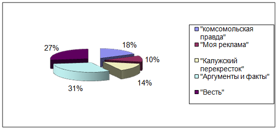 2. Вторым по популярности средством массовой информации являются газеты-25%(78 чел). Поэтому необходимо увеличить количество публикаций о Калужском отделении Сбербанка России. Как показало исследование, уже имеющиеся публикации сложны для восприятия внешней аудиторией банка и следовательно, что бы информация лучше доходила до клиентов, нужно их упростить. Наиболее читаемой газетой, по результатам проведенного исследования является «Аргументы и факты»-29%(89 чел) поэтому желательно давать более значимые публикации о деятельности Сбербанка России именно в эту газету.