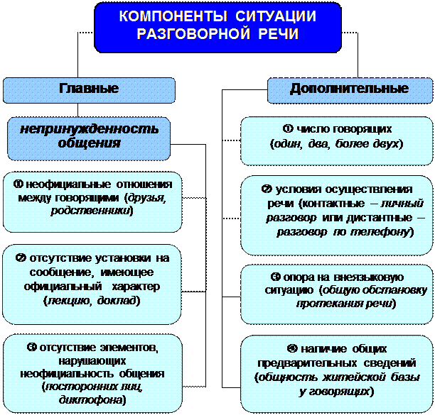 | ТЕМА 6. РАЗГОВОРНАЯ РЕЧЬ В СИСТЕМЕФУНКЦИОНАЛЬНЫХ РАЗНОВИДНОСТЕЙ РУССКОГО ЛИТЕРАТУРНОГО ЯЗЫКА §1. Разговорный стиль речи(общая характеристика) Разговорный стиль противопоставлен книжным стилям в целом. Этим определяется его особое место в системе функциональных разновидностей русского литературного языка. Разговорный стиль – это наиболее традиционный коммуникативный стиль, обслуживающий бытовую сферу общения. Он предусматривает близкое знакомство, социальную общность участников разговора, отсутствие в общении элемента формальности. Разговорный стиль характеризуется массовостью употребления. Им пользуются люди всех возрастов, всех профессий не только в быту, но и в неофициальном, личном общении в общественно-политической, производственно-трудовой, учебно-научной сферах деятельности. Он широко представлен в художественной литературе. Разговорная речь занимает исключительное положение в современном русском языке. Это исконный стиль национального языка, в то время как все другие – явления более позднего (часто даже исторически недавнего) периода. Специфической определяющей чертой разговорной речи является то, что она используется в условиях неподготовленного, непринужденного общения при непосредственном участии говорящих. §2. Компоненты ситуации разговорной речи Ситуация разговорной речи складывается из специфических компонентов , которые определяют выбор говорящим именно разговорной разновидности языка. К трем главным компонентам ситуации относятся: 1) неофициальные отношения между говорящими, т.е. близкие (дружеские, родственные) или нейтральные; 2) отсутствие у говорящих установки на сообщение, имеющее официальный характер (лекцию, доклад, выступление на собрании, ответ на экзамене, научный диспут и т.д.); 3) отсутствие элементов, нарушающих неофициальность общения (посторонних лиц, магнитофона для записи речи и т.п.). Именно этими компонентами создается непринужденность общения. Кроме трех перечисленных компонентов ситуации существуют дополнительные компоненты, которые также влияют на выбор и построение разговорной речи. К ним относятся: 1) число говорящих и жанр речи (монолог, диалог, полилог); 2) условия осуществления речи; 3) опора на внеязыковую ситуацию; 4) наличие общего житейского опыта, общих предварительных сведений у собеседников. Рассмотрим эти компоненты. 1. Число говорящих определяется таким образом: один, два, более двух . В соответствии с этим различают следующие жанры разговорной речи: монолог, диалог, полилог . Названные жанры имеют свою специфику. Отличительная черта монолога в разговорной речи – его диалогичность, т.е. обращенность к слушателю, который может перебить рассказчика, задать ему вопрос, согласиться с ним или возразить ему в любую минуту. Сравни: в монологических видах речи книжного литературного языка говорящего (докладчика, лектора, оратора на митинге) не принято перебивать. Диалог – основной жанр разговорной речи. Для него характерна частая смена ролей "говорящий – слушающий", так что собеседники поочередно выступают то в одной, то в другой роли. В реальной разговорной речи монолог и диалог представлены обычно не в чистом виде, а в пересекающихся формах: диалог может содержать элементы монолога (микрорассказы, минимонологи), а монолог – перебиваться репликами собеседник