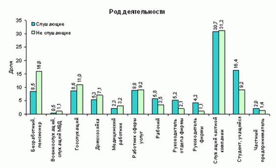 2. Из всех СМИ радио является самым удобным («неприхотливым», «комфортным») для восприятия аудиторией. Слушание радио, как правило, не требует отказа от повседневных дел, его можно совместить и с производственной занятостью, и с бытовыми реалиями (уборкой квартиры, хозяйственными делами и т.п.). Колоссальную часть аудитории радио во всех направлениях вещания – от музыкальных программ, новостных выпусков до передач литературно-драматических композиций и «радиокниг» – составляют автомобилисты за рулем и их пассажиры. Более того, разнообразие интересов именно этой части аудитории стимулировало значительное расширение жанрово-тематических параметров вещания (что в свою очередь способствовало увеличению числа современных форматов радиостанций, а также увеличению количества самих станций, более четкой их адресной и содержательной направленности и дифференциации).