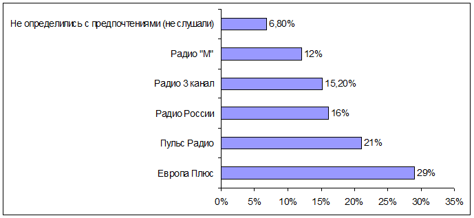 При опросе респондентов учитывались все ответы с упоминанием названий радиостанций, работающих в Йошкар-Оле как в эфирном ( Радио России, Европа Плюс ) так и в проводном вещании ( Радио 3 канал, Радио России, Радио М ).