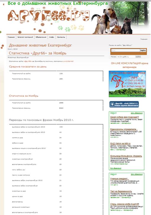 -Повышение рейтинга сайта в поисковой системе YANDEX до 1 страницы 1 места (при введении слов «домашние животные» город Екатеринбург)сейчас 5 место .