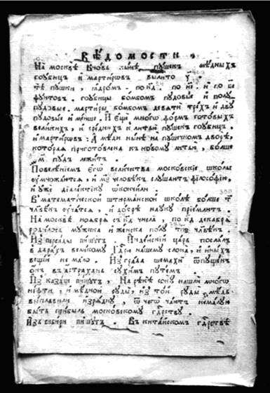 Чтобы убедиться в том, какая панорама жизни открывалась, Например, жителю петровской Московии, познакомимся кратко с содержанием одного из первых номеров газеты «Ведомости»: