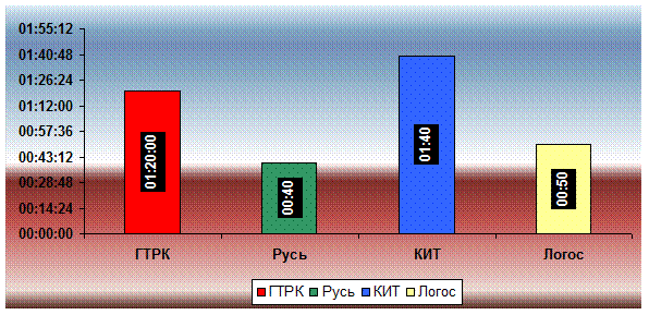 Все четыре выпуска отличаются продолжительностью, соотношением в выпуске сюжетов и инсертов и версткой. Самая удачная, на наш взгляд, в этот день верстка выпуска «ГТРК»: первый сюжет на социальную тему, далее возвращение к теме 32 лицея, сюжет о происшествии, сюжет о криминале, два инсерта о культуре («выставка» и выступление хора) и сюжет на тему спорта (чемпионат по шашкам). Самая неудачная, на мой взгляд, в этот день верстка у «Руси» - из 12 материалов выпуска 4 материала подряд вышло на криминальную тему.