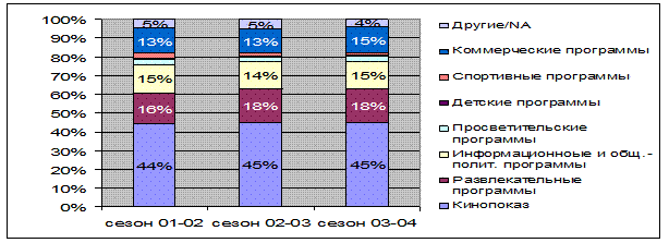 Как видно из диаграмм, интерес к информационному вещанию существенно снизился по сравнению с предыдущим десятилетием. Информационное вещание заняло свою нишу, в то время как ниша художественно-публицистических и развлекательных жанров с каждым годом расширяется.