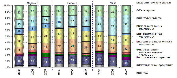 Жанровая структура эфира федеральных телеканалов в 2005 - 2007 гг., %
