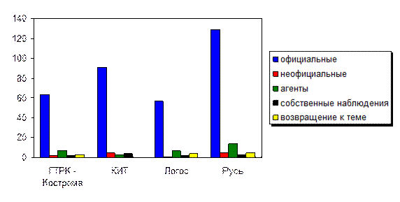 На основании мониторинга мы пришли к выводу, что доля официальных источников информации превышена, таким образом, то, что появляется в эфире идет с подачи официальных лиц (посредством присылаемых в редакцию пресс-релизов, телефонограмм). Собственными наблюдениями в большей доле пользуются на сегодня журналисты телеканала «КИТ», к информации от агентов чаще прибегает телеканал «Русь».