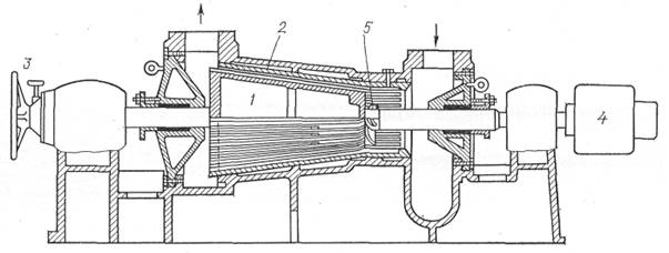1 — вход массы; 2— выход массы; 3 — статор; 4 — вращающийся диск