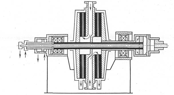 В приложении 5 показана схема одной из высокопроизводительных сдвоенных дисковых мельниц, работающих при концентрации массы до 6 %. Мельница имеет неподвижный средний диск и вращающиеся крайние диски, которые могут с помощью гидравлической системы перемещаться в осевом направлении. Они установлены на сквозном валу, проходящем через средний диск. Подводящие и выходные отверстия для массы выполнены так, что возможно параллельное и последовательное ее движение между поверхностями размола.