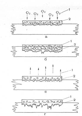 Схема закрепления на бумаге красок: а — химическое пленкообразование; в — испарение растворителя; г — быстрое отделение жидкой фазы из системы, близко подведенной к кристаллическому состоянию