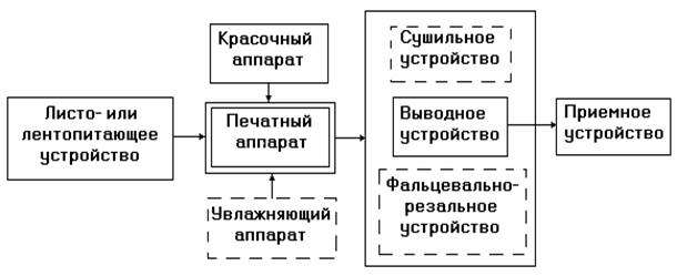 На схеме в прямоугольниках представлены основные узлы печатной машины. Штриховой линией обозначены те узлы, которые в некоторых видах машин могут отсутствовать (рис.1.)