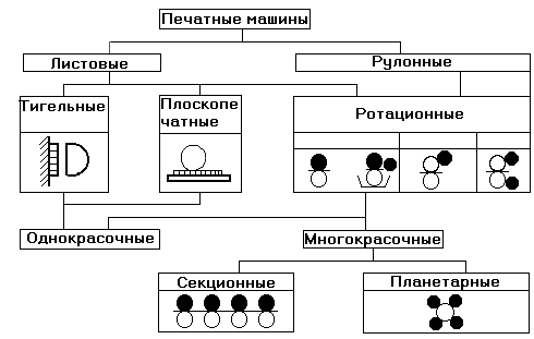 Многокрасочные машины, составленные из однотипных однокрасочных печатных секций, получили название секционных, а многокрасочные машины, содержащие один общий печатный цилиндр, вокруг которого установлены другие цилиндры, получили название планетарных. Плоскопечатные и тигельные машины строятся для высокого способа печати, а ротационные - для высокого, офсетного и глубокого способов печати. Ротационные машины строятся как односторонними, так и двухсторонними, в которых материал одновременно или последовательно запечатывается с двух сторон.