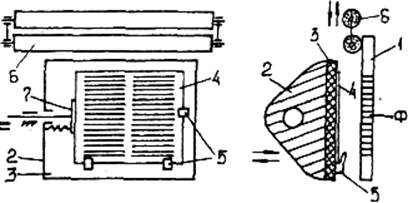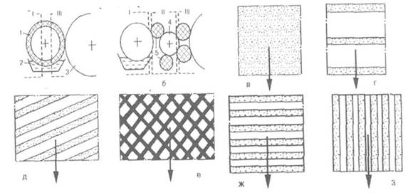 На рис1. а изображена упрощенная структурно-принципиальная схема красочного аппарата контактного типа, в котором краска или влага передается на форму с помощью давления. Валик 1 выводит из резервуара 2 краску или влагу и наносит ее на форму 3, выполняя функции подающей I и накатной III групп. В красочных аппаратах машин глубокой печати валик 1 чаще всего отсутствует. В состав раскатной группы II (рис1,6) входят один или несколько жестких цилиндров 4 и эластичных валиков 5.