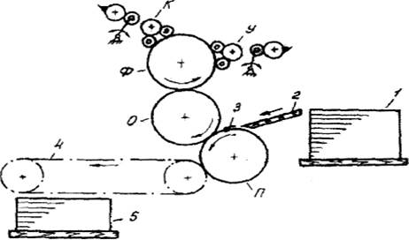 Увлажнение формы происходит с помощью увлажняющего аппарата У. Увлажнение формы необходимо для предохранения пробельных элементов от взаимодействия с краской. Из захватов печатного цилиндра оттиска цепным транспортером 4 выводится на стол приемного устройства 5.
